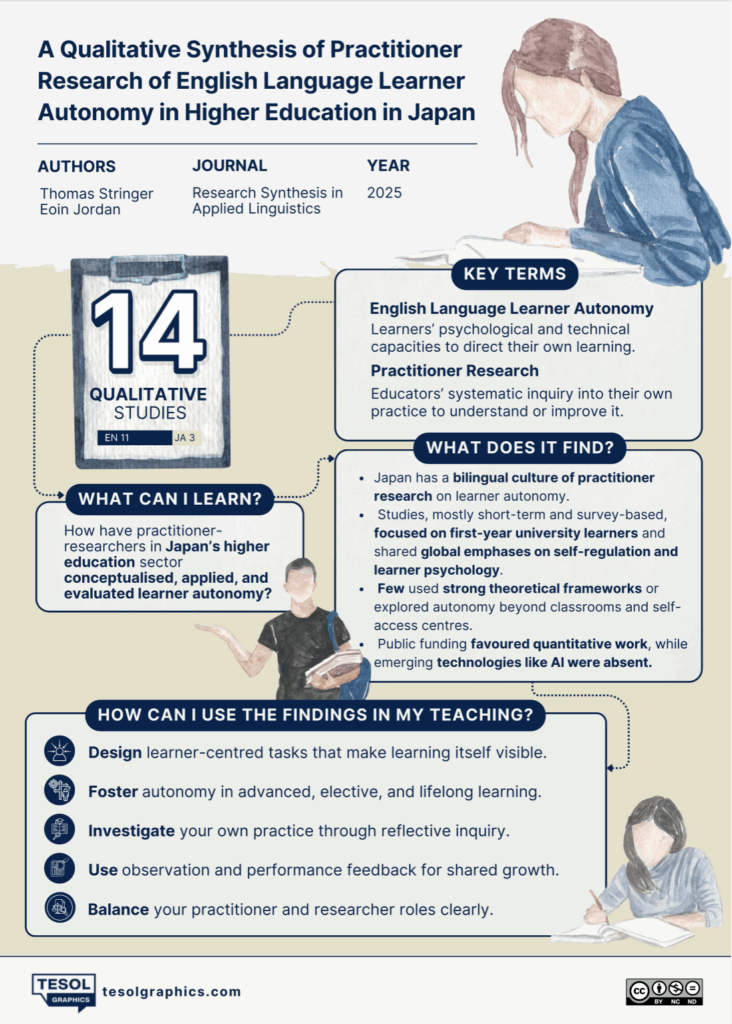 Stringer, T., & Jordan, E. (2025). A Qualitative Synthesis of Practitioner Research of English Language Learner Autonomy in Higher Education in Japan. Research Synthesis in Applied Linguistics, 1–45. https://doi.org/10.1080/29984475.2025.2584790
